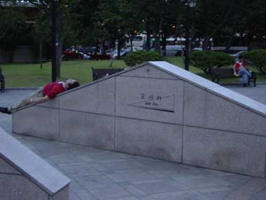 | デグは駅舎とバスターミナルがかなり近い場所にあってその中心になる位置に小さな公園があって噴水の周りに座って本を読んだり、ボケーっと座ってたり出来るようになってました。 これはその公園にあった妙なオブジェー(?)。東西南北を示す印の周りに世界の色んな都市までの距離が書かれていました。赤いおじさん(?)が寝ているのは「大阪880km」と書いてある石の上です。^^;。しかし何故に大阪? |