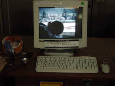 ターミナルの中に設置されているパソコン。そういえばソウルにもこんなのがあった覚えが…。ただし、こっちの端末の凄さは100ウォン玉を入れないと使えないという事です。^^;。 100ウォン玉一つで4分。500ウォン玉一つで20分使えるそうでした。 まあ、値段としてはそんなに高くない感じですが…公衆電話じゃないんですからね。100円玉はないんじゃないの?という感じでしたね。^^;。 |